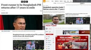 আন্তর্জাতিক ডেস্ক : তারেক রহমানের এ স্বদেশ প্রত্যাবর্তনের খবর বেশ ফলাও করে প্রচার করেছে আন্তর্জাতিক সংবাদমাধ্যমগুলো। ব্রিটিশ সংবাদমাধ্যম বিবিসি লিখেছে, “বাংলাদেশের পরবর্তী প্রধানমন্ত্রী হওয়ার দৌড়ে এগিয়ে থাকা শীর্ষ নেতা ১৭ বছরের…