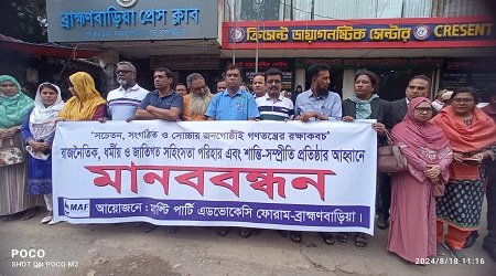 বাদল আহাম্মদ খান ,ব্রাহ্মণবাড়িয়া জেলা প্রতিনিধি : ব্রাহ্মণবাড়িয়ায় রাজনৈতিক, ধর্মীয় ও জাতিগত সহিংসতা পরিহার করে শান্তি-সম্প্রীতি প্রতিষ্ঠার আহবান জানিয়ে রবিবার সকালে মানববন্ধন অনুষ্ঠিত হয়েছে। মাল্টিপার্টি অ্যাডভোকেসি ফোরাম (ম্যাফ) এর উদ্যোগে