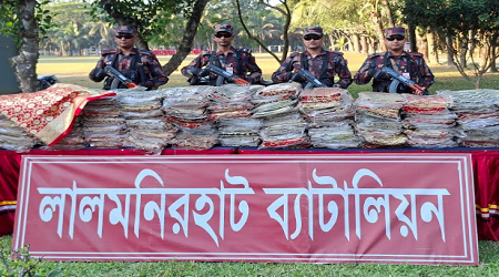 জিন্নাতুল ইসলাম জিন্না, লালমনিরহাট প্রতিনিধি : সীমান্তে চোরাচালানবিরোধী অভিযানে একটি বিশাল সাফল্য অর্জন করেছে লালমনিরহাট ব্যাটালিয়ন (১৫ বিজিবি)। কুড়িগ্রামের ভুরুঙ্গামারী সীমান্ত এলাকা থেকে বিপুল পরিমাণ অবৈধ ভারতীয় স্বর্ণ কাতান শাড়ির