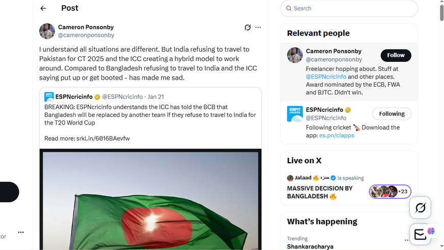 বাংলাদেশ দলকে নিয়ে আইসিসির এমন দ্বিমুখী আচরণে হতাশ ক্রিকেটের জনপ্রিয় ওয়েবসাইট ক্রিকইনফোর জনপ্রিয় সাংবাদিক ক্যামেরন পনসনবি। তিনি বলেছেন, বুঝতে পারছি, সব পরিস্থিতি এক নয়। কিন্তু চ্যাম্পিয়ন্স ট্রফি ২০২৫-এর জন্য ভারত পাকিস্তানে যেতে অস্বীকৃতি জানালে আইসিসি তখন একটি হাইব্রিড মডেল তৈরি করে সমাধান বের করেছিল।