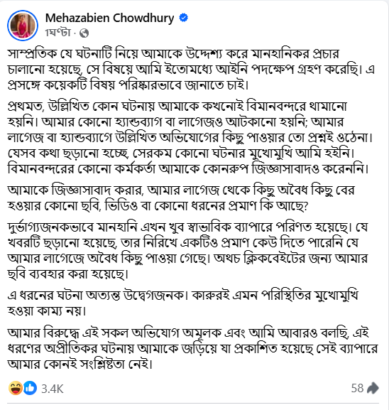 মঙ্গলবার (২৪ ফেব্রুয়ারি) নিজের ভেরিফায়েড ফেসবুক পেজে দেওয়া পোস্টে তিনি বলেন, সম্প্রতি তাকে জড়িয়ে যে মানহানিকর প্রচার চালানো হয়েছে, সে বিষয়ে তিনি ইতোমধ্যে আইনি পদক্ষেপ নিয়েছেন। তার দাবি, উল্লিখিত কোনো ঘটনায় তাকে কখনোই বিমানবন্দরে আটকানো হয়নি। এমনকি তার কোনো হ্যান্ডব্যাগ বা লাগেজও জব্দ করা হয়নি। তার লাগেজে অবৈধ কিছু পাওয়ার প্রশ্নই ওঠে না বলেও উল্লেখ করেন তিনি।