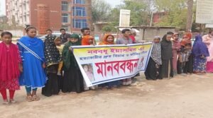 সজিব হোসেন ,নওগাঁ জেলা প্রতিনিধি : নওগাঁয় গৃহবধূ ইয়াসমিন বানুর হত্যায় জড়িতদের বিচার চেয়ে মানববন্ধন করেছে স্বজন ও এলাকাবাসী। রোববার (৮ মার্চ) বেলা সাড়ে ১১টায় শহরের মুক্তির মোড় কেন্দ্রীয় শহীদ মিনারের সামনের সড়কে ঘন্টাব্যাপী এ কর্মসূচি পালন করা হয়। গৃহবধূ ইয়াসমিন বানু বদলগাছী উপজেলার ভরট্র গ্রামের রিয়াজ উদ্দিনের মেয়ে।