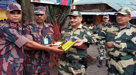 ডেস্ক নিউজ : পবিত্র ঈদুল ফিতর উপলক্ষে দিনাজপুরের হিলি সীমান্তে ভারতের সীমান্ত রক্ষী বাহিনী বিএসএফ ও বর্ডার গার্ড বাংলাদেশ-বিজিবি মিষ্টি দিয়ে শুভেচ্ছা বিনিময় করেছে। মঙ্গলবার বেলা সাড়ে ১১টায় হিলি সীমান্তের শূন্য রেখায় বিএসএফ ও বিজিবি উভয়ে মিষ্টি উপহার দেয়।