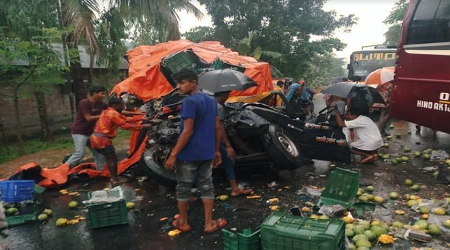নিহত চালকের নাম শরীফ রহমান (৩০)। তিনি নীলফামারীর সৈয়দপুর উপজেলার নতুন বাবুপাড়া এলাকার বাসিন্দা বলে জানিয়েছেন পাঁচবিবি ফায়ার সার্ভিস ও সিভিল ডিফেন্সের স্টেশন ব্যবস্থাপক রতন হোসেন। প্রত্যক্ষদর্শীরা জানায়, আমবোঝাই পিকআপ ভ্যানটি হিলির দিকে যাচ্ছিল। হিলি থেকে ঢাকার উদ্দেশে ছেড়ে আসা হানিফ পরিবহনের বাসটি জয়পুরহাটের দিকে যাবার পথে বাগজানা বাজারে আমবোঝাই পিকআপ ভ্যান ও হানিফ পরিবহনের বাসের মুখোমুখি সংঘর্ষ হয়। এতে আমবোঝাই পিকআপ ভ্যানের সামনের কেবিনের অংশ দুমড়ে-মুচড়ে যায়। পিকআপ ভ্যানচালক কেবিনের ভেতর আটকা পড়েন।