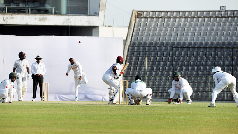 ত্যাগনারায়ণ চন্দরপল ধীরস্থির হয়ে খেললেও উইকেটে এসেই পাল্টা আক্রমণ করে বসেন অ্যালিক অ্যাথানজে। বলের সঙ্গে পাল্লা দিয়ে রান তুলতে থাকেন তিনি। ৬৬ বলে ৫৯ রানের ওয়ানডে মেজাজের ইনিংস খেলে সাজঘরে ফেরেন তিনি। তাকে ফেরান বাঁহাতি স্পিনার নাসুম আহমেদ। তবে ততক্ষণে চাপ সামলে গতি পেয়ে গেছে ক্যারিবীয়দের ইনিংস।