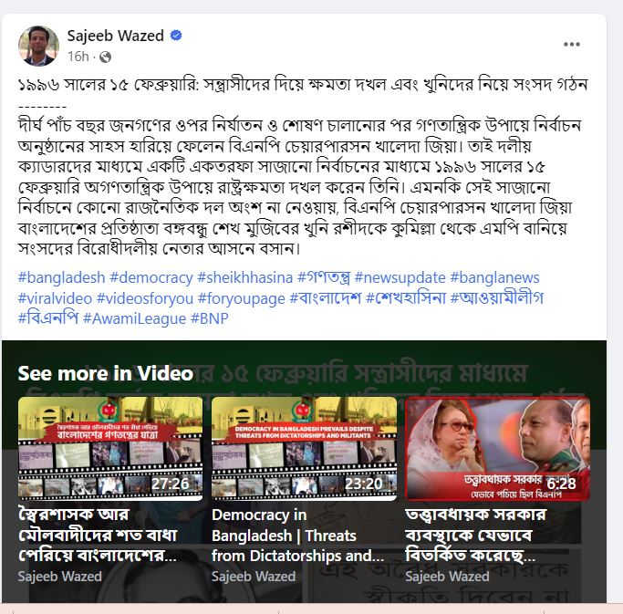 জয় লিখেছেন, দীর্ঘ পাঁচ বছর জনগণের ওপর নির্যাতন ও শোষণ চালানোর পর গণতান্ত্রিক উপায়ে নির্বাচন অনুষ্ঠানের সাহস হারিয়ে ফেলেন বিএনপি চেয়ারপারসন খালেদা জিয়া। তাই দলীয় ক্যাডারদের মাধ্যমে একটি একতরফা সাজানো নির্বাচনের মাধ্যমে ১৯৯৬ সালের ১৫ ফেব্রুয়ারি অগণতান্ত্রিক উপায়ে রাষ্ট্রক্ষমতা দখল করেন তিনি। এমনকি সেই সাজানো নির্বাচনে কোনো রাজনৈতিক দল অংশ না নেয়ায়, বিএনপি চেয়ারপারসন খালেদা জিয়া বাংলাদেশের প্রতিষ্ঠাতা বঙ্গবন্ধু শেখ মুজিবের খুনি রশীদকে কুমিল্লা থেকে এমপি বানিয়ে সংসদের বিরোধীদলীয় নেতার আসনে বসান।