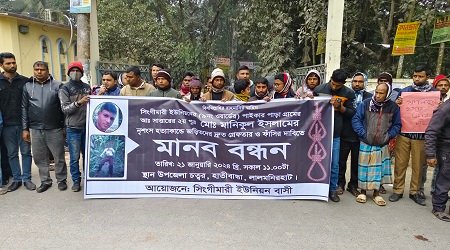 স্থানীয়রা ও পুলিশ জানান, গত ১৩ জানুয়ারী হাতীবান্ধা উপজেলা পরিষদের সামনে থেকে বাবুল নামে এক ব্যক্তির একটি ভ্যান চুরি হয়। ওই চুরির ঘটনায় সন্দেহ করা হয় সিঙ্গিমারী গ্রামের আব্দুস ছাত্তারের পুত্র মানিকুল ইসলামকে। ঘটনার দিন থেকে নিখোঁজ মানিকুল। ১৯ জানুয়ারী ওই উপজেলার রমনীগঞ্জ এলাকা থেকে মানিকুলের মাথা বিহীন দেহ উদ্ধার করে পুলিশ। এক দিন পর দালালপাড়া এলাকা থেকে মাথা, মোবাইল ও ছুড়ি উদ্ধার করে পুলিশ। এ ঘটনার পর পরেই বাড়ি ছাড়া হয় সিরাজুল ও রশিদুলও। ওই হত্যাকান্ডের ঘটনায় শুক্রবার মানিকুলের মা বাদী হয়ে স্থানীয় থানায় একটি মামলা দায়ের করলেও ৩ দিনেও কাউকে গ্রেফতার করতে পারেনি পুলিশ।রোববার সকালে হাতীবান্ধা উপজেলা পরিষদের গেটে মানববন্ধন ও সড়ক অবরোধে অংশ নিয়ে হত্যাকান্ডের শিকার মানিকুলের স্ত্রী শাকিলা বলেন, আজ ৭২ ঘন্টা পার হয়ে গেলে এখনো এ হত্যাকান্ডের সাথে কারা জড়িত তা পুলিশ বের করতে পারেনি। আমি আমার স্বামীর হত্যকান্ডের বিচার চায় এবং কেন এখনো হত্যাকারীরা গ্রেফতার হলো না তা জানতে চাই।স্কুল শিক্ষক আজিজুল বারী বলেন, চুরি হওয়া ভ্যান উদ্ধার হলো। ওই চুরির সাথে কারা কারা জড়িত তা প্রমাণিত। তাহলে এ হত্যাকান্ডের সাথে কে বা কারা জড়িত তা কিন্তু পরিস্কার। তারপরও পুলিশ তাদের কি কারণে গ্রেফতার করতে পারছে না। পরিবেশটা দেখে মনে হচ্ছে আমাদের সান্ত¦না দিতে সন্দেহের বেড়াজালে নিরপরাধ মানুষকে হয়রানি করতে গ্রেফতার করা হতে পারে।হাতীবান্ধা থানার ওসি সাইফুল ইসলাম বলেন, আমরা আমাদের সাধ্যমত হত্যাকারীদের গ্রেফতারের চেষ্টা চলছে। আশাকরি দ্রুত সময়ের মধ্যে হত্যাকারীরা গ্রেফতার হবে।