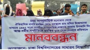 জালাল আহমদ, ঢাকা বিশ্ববিদ্যালয় প্রতিনিধি : ভারতের উত্তরপ্রদেশের অযোধ্যায় অবস্থিত কয়েক শতাব্দীর প্রাচীন ঐতিহাসিক বাবরী মসজিদ ভেঙে একই স্থানে রাম মন্দির প্রতিষ্ঠার নির্মাণের কাজ উদ্বোধনের প্রতিবাদে বিক্ষোভ প্রদর্শন করেছে ঢাকা বিশ্ববিদ্যালয়ের শিক্ষার্থীরা।দুপুরে ঢাকা বিশ্ববিদ্যালয়ের সাধারণ শিক্ষার্থীরা রাজু ভাস্কর্যের পাদদেশে দাঁড়িয়ে মানববন্ধন ও সন্ধ্যায় প্রগতিশীল ছাত্রসমাজ বিক্ষোভ সমাবেশ করেছে।
