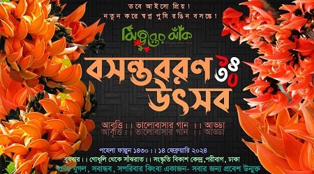 সাহিত্য ডেস্ক : এক সংবাদ বিজ্ঞপ্তিতে জানানো হয়েছে, আবৃত্তি সংগঠন ঝিঙুরের ঝাঁক পঞ্চমবারের মতো বসন্তবরণ উৎসব আয়োজন করতে যাচ্ছে। এতে আবৃত্তি ও সঙ্গীত পরিবেশন করবেন, স্বাধীন বাংলা বেতার কেন্দ্রের শব্দসৈনিক ও দেশবরেণ্য আবৃত্তিশিল্পী আশরাফুল আলম, একুশে পদকপ্রাপ্ত সঙ্গীতশিল্পী শাহীন সামাদ, একুশে পদকপ্রাপ্ত আবৃত্তি শিল্পী ড. ভাস্বর বন্দ্যোপাধ্যায়, বাংলা একাডেমি পুরস্কারপ্রাপ্ত কবি ও কথাসাহিত্যিক শামীম আজাদ, বরেণ্য আবৃত্তিশিল্পী বেলায়েত হোসেন, ডালিয়া আহমেদ, লায়লা আফরোজ, গোলাম সারোয়ার, মীর বরকত, মাহিদুল ইসলাম।