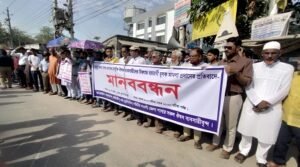 নওগাঁয় ঔষধ ব্যবসায়ীদের বিরুদ্ধে হয়রানি মূলক মামলার প্রতিবাদে মানববন্ধন