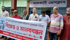 বাংলাদেশ প্রতিদিন, নিউজ টোয়েন্টিফোর ও ডেইলি সান পত্রিকার ঝালকাঠি প্রতিনিধি এস এম রেজাউল করিমের সঞ্চালনায় বক্তব্য রাখেন, সাবেক ডেপুটি কমান্ডার প্রবীন সাংবাদিক দুলাল সাহা, সময় টেলিভিশন প্রতিনিধি পলাশ রায়, সিনিয়র আইনজীবি ও সাংবাদিক নাসির উদ্দিন কবির, ঝালকাঠি টেলিভিশন সাংবাদিক সমিতির সভাপতি আজমীর হোসেন তালুকদার, ঝলকাঠি প্রেসক্লাবের যুগ্ম সাধারন সম্পাদক আসম মাহমুদুর রহমান পারভেজ, জাতীয় সাংবাদিক সংস্থার ঝালকাঠি শাখার সভাপতি এমদাদুল হক স্বপন, ইনডেপিনডেন্ট টিভির প্রতিনিধি রহিম রেজা। মানববন্ধনে সাংবাদিক ও বিভিন্ন পেশার মানুষ অংশ গ্রহন করেন।