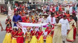নওগাঁ প্রতিনিধি : নওগাঁয় নানা আয়োজনের মধ্য দিয়ে পহেলা বৈশাখ উদযাপন করা হচ্ছে। সোমবার জেলা প্রশাসনের আয়োজনে সকাল সাড়ে ৮টায় শহরের এটিম মাঠ থেকে বর্ণাঢ্য আনন্দ শোভাযাত্রা বের হয়। শোভাযাত্রার নেতৃত্ব দেন জেলা প্রশাসক আব্দুল আউয়াল। এর আগে সেখানে জাতীয় সঙ্গীত, বেলুন ও পায়রা উড়ান জেলা প্রশাসক।শোভাযাত্রাটি শহরের বিভিন্ন সড়ক প্রদক্ষিণ করে বিয়াম ল্যাবরেটরি স্কুল ও কলেজ প্রাঙ্গনে গিয়ে শেষ হয়। সেখানে এক আলোচনা ও সাংস্কৃতিক অনুষ্ঠান হয়। এসময় পুলিশ সুপার মোহাম্মদ সাফিউল সারোয়ার, বিভিন্ন সরকারি-বেসরকারি অফিসের কর্মকর্তা-কর্মচারী, সামাজিক সাংস্কৃতিক সংগঠন, বিভিন্ন শিক্ষা প্রতিষ্ঠানের শিক্ষক-শিক্ষার্থীসহ বিভিন্ন শ্রেনি-পেশার মানুষ শোভাযাত্রায় অংশ নেয়। গ্রামীন ঐতিহ্য হিসেবে গরু ও ঘোড়ার গাড়ি শোভাযাত্রায় অংশ নেয়।