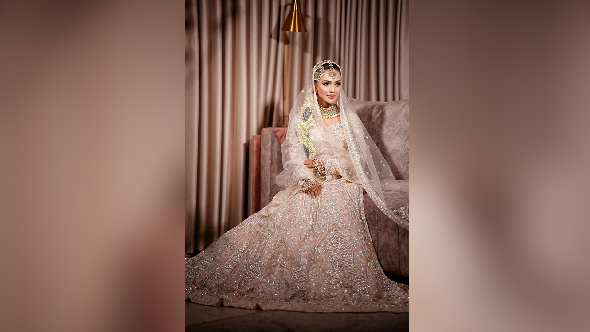 সাদা রংয়ের লেহেঙ্গায় ছিল স্টোন ও সুতার কাজ। রুপালি রংয়ের স্টোন বসানো লেইসে ছিল হালকা কাজের প্রাধান্য।