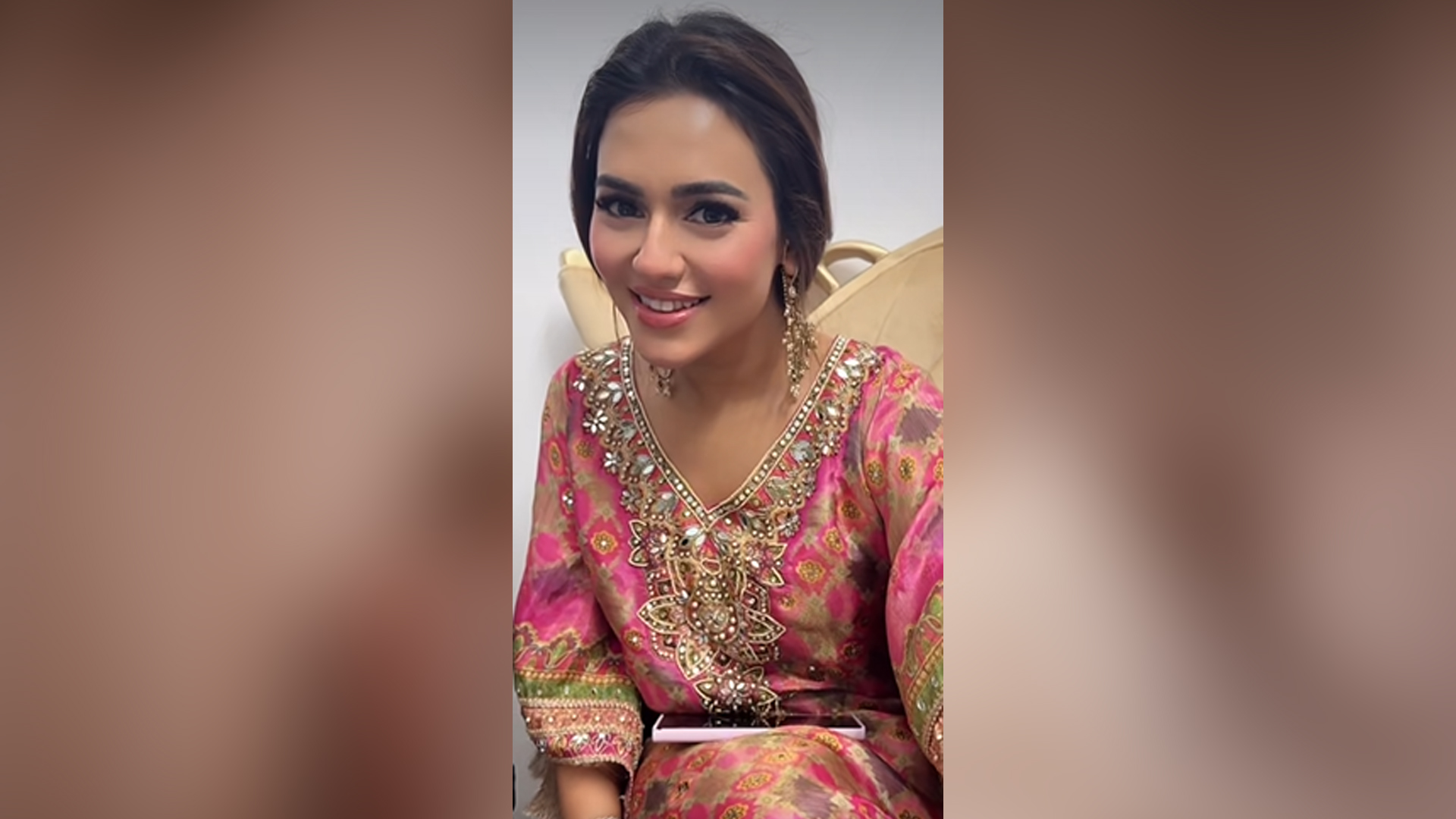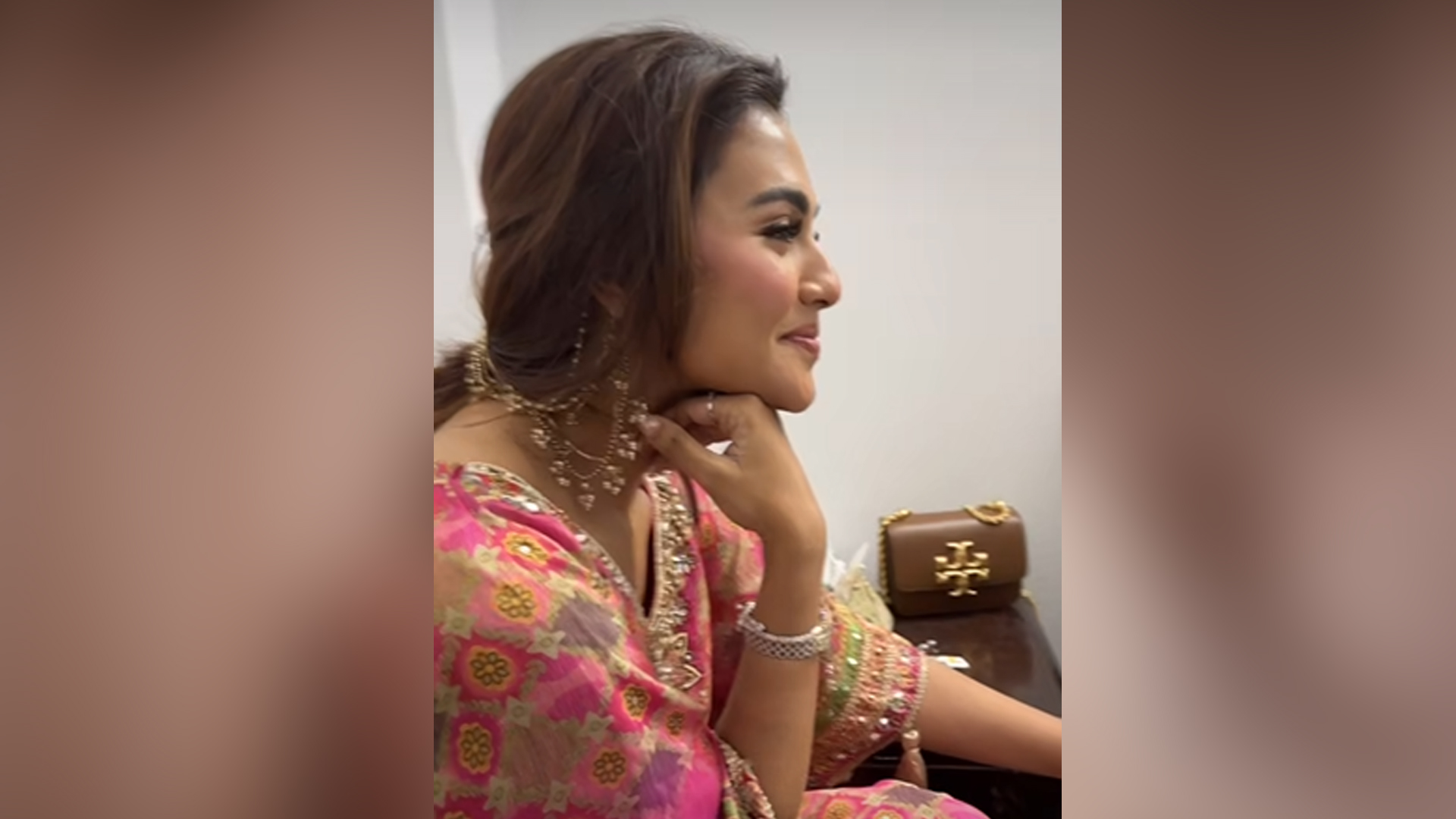 মেহেদি পরার সময় গোলাপি সালোয়ার কামিজে ধরা দেন ফারিয়া।
