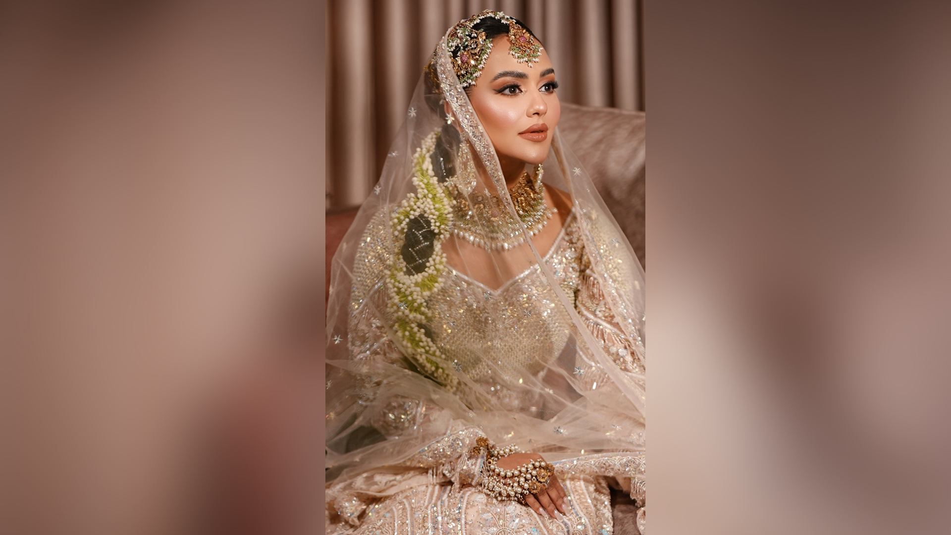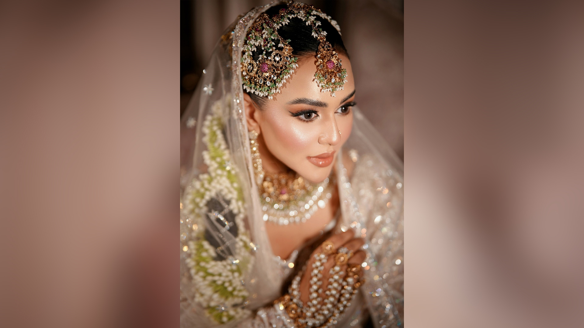 পোশাকের সঙ্গে মিল রেখে পরেছিলেন স্টোন ও পুতির ভারী গয়না। চুল বেনী করে তাতে ফুলের গাজরা লাগানো ছিল।