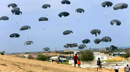 ইসরায়েলের এক কর্মকর্তা জানিয়েছেন, আজই জর্ডান থেকে বিমানযোগে গাজায় ত্রাণ ফেলা হতে পারে। এর আগেও ২০২৩ সালে যুক্তরাষ্ট্র, জর্ডান, মিশর ও ফ্রান্স যৌথভাবে আকাশপথে গাজায় কয়েক হাজার ত্রাণ প্যাকেট পাঠিয়েছিল। তবে সে সময় এসব প্যাকেটের কিছু জনবহুল এলাকায় পড়ে ৫ জন গাজাবাসীর মৃত্যু ঘটে। ছোট প্যারাস্যুটে করে খোলা জায়গা লক্ষ্য করে এসব ত্রাণ পাঠানো হলেও, বাতাসের কারণে তা সঠিক স্থানে না পড়ে দুর্ঘটনা ঘটেছিল।