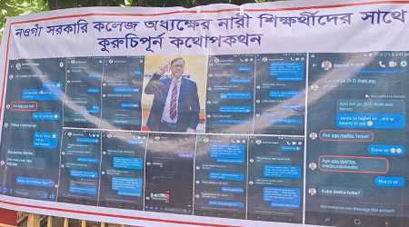 নওগাঁ সরকারি কলেজের অধ্যক্ষ অধ্যাপক সামসুল হকের বিরুদ্ধে এমন অভিযোগ। সম্প্রতি এসংক্রান্ত বিভিন্ন স্ক্রিনশট সামাজিক যোগাযোগমাধ্যমে ছড়িয়ে পড়েছে। এসব স্ক্রিনশটে ছাত্রীদের ওড়না ছাড়াসহ বিভিন্ন সাজে দেখার আবদার করতে দেখা গেছে অধ্যক্ষ সামসুল হককে। ভাইরাল হওয়া স্ক্রিনশটগুলো যাচাই সাপেক্ষে অভিযুক্তের বিরুদ্ধে শাস্তিমূলক ব্যবস্থ নেওয়ার দাবি জানিয়েছেন অভিভাবকরা স্ক্রিনশটগুলোতে দেখা যায়, ওই শিক্ষার্থীর সৌন্দর্যের প্রশংসা করেন শিক্ষক সামসুল। এরপর তার কাছে ছবি চান।