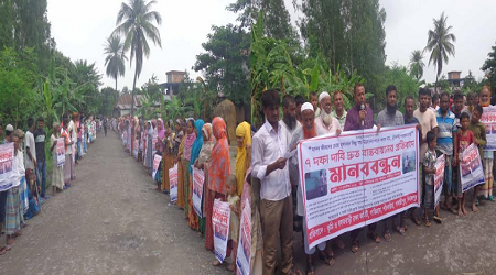 মোঃ আফজাল হোসেন, দিনাজপুর প্রতিনিধি : দিনাজপুরের বড়পুকুরিয়া কয়লা খনি এলাকার পাতিগ্রাম মোড়ে ৭ দফা দাবি দ্রুত বাস্তবায়নের লক্ষে মানববন্ধন ও বিক্ষোভ সমাবেশ করেন ভূমি ও বসতবাড়ি রক্ষা কমিটি। গতকাল বুধবার সকাল ১১ টায় দিনাজপুরের পার্বতীপুর উপজেরার হামিদপুর ইউনিয়নের পাতিগ্রাম ও পাঁচঘরিয়া গ্রামের প্রায় ৪ হাজার নারী পুরুষ ৭ দফা দাবী বাস্তবায়নের লক্ষে ঘন্টা ব্যাপি মাববন্ধন ও বিক্ষোভ সমাবেশ করেন।