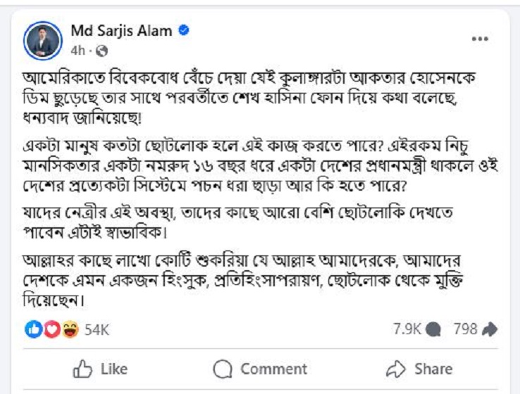 সারজিস লেখেন, ‘আমেরিকাতে বিবেকবোধ বেচে দেওয়া যেই কুলাঙ্গারটা আকতার হোসেনকে ডিম ছুড়েছে। তার সঙ্গে পরবর্তী সময় শেখ হাসিনা ফোন দিয়ে কথা বলেছে, ধন্যবাদ জানিয়েছে! একটা মানুষ কতটা ছোটলোক হলে এই কাজ করতে পারে?’