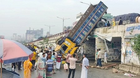 ডেস্ক নিউজ : ঢাকা-নারায়ণগঞ্জ লিংক রোডে নারায়ণগঞ্জের ফতুল্লার ভূঁইঘর এলাকায় দ্রুতগামী একটি ট্রাক নিয়ন্ত্রণ হারিয়ে আন্ডারপাসের ওপরের রেলিং ভেঙে ঝুলে থাকে। এভাবে বেশ কয়েক ঘণ্টা থাকার পর সেটি নিচে পড়ে যায়।