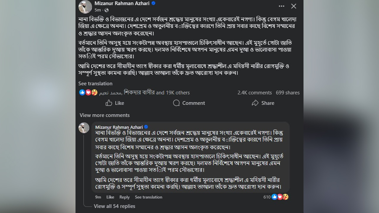 পোস্টের শেষে আজহারী বলেছেন, আমি দেশের তরে সীমাহীন ত্যাগ স্বীকার করা ধর্মীয় মূল্যবোধে শ্রদ্ধাশীল এ মহিয়সী নারীর রোগমুক্তি ও সম্পূর্ণ সুস্থতা কামনা করছি। আল্লাহ তায়ালা তাকে দ্রুত আরোগ্য দান করুন।